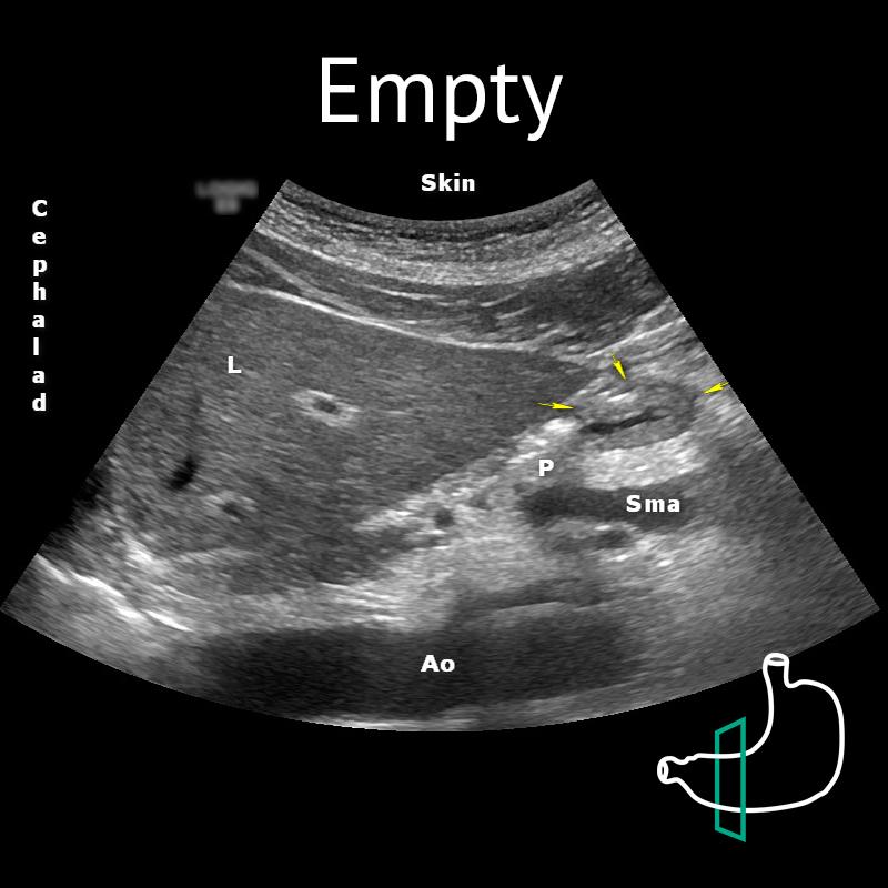 Ao: aorta; L: liver; P: pancreas; Sma: superior mesenteric artery; Yellow arrows: antrum