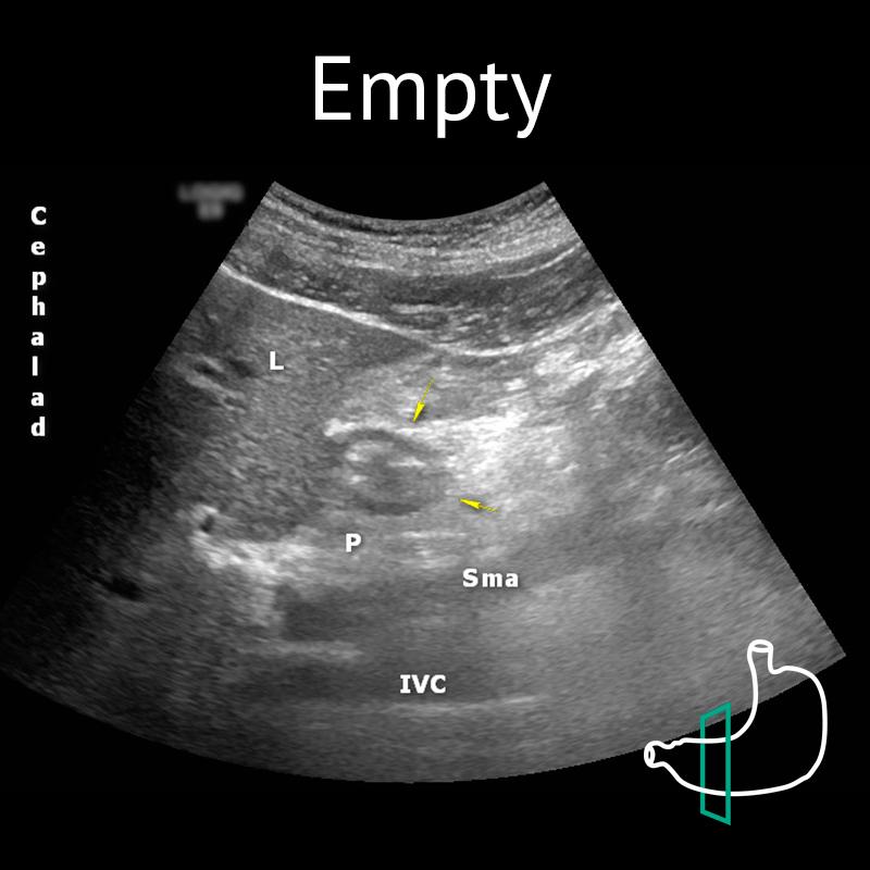 IVC: inferior vena cava; L: liver; P: pancreas; Sma: superior mesenteric artery; Yellow arrows: antrum