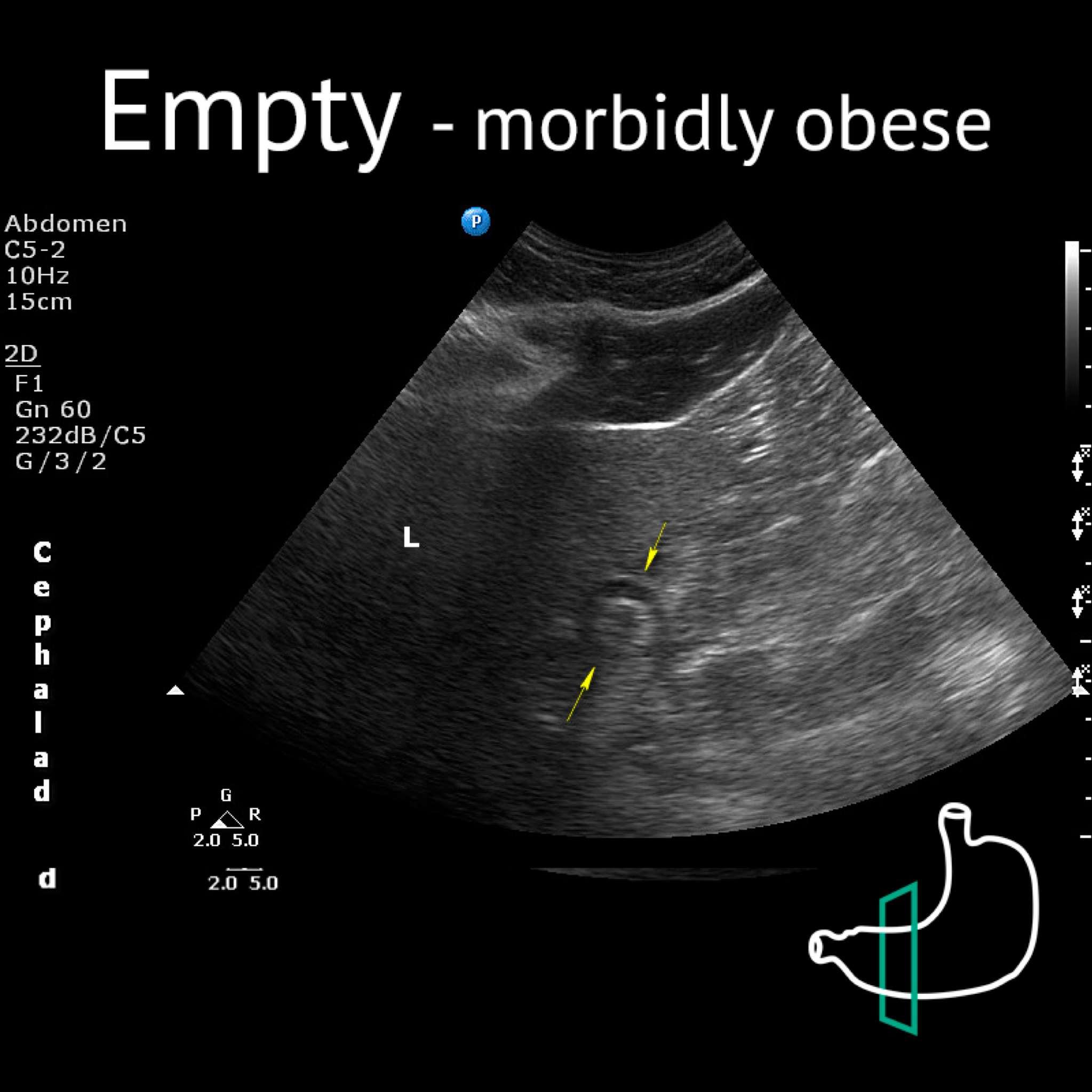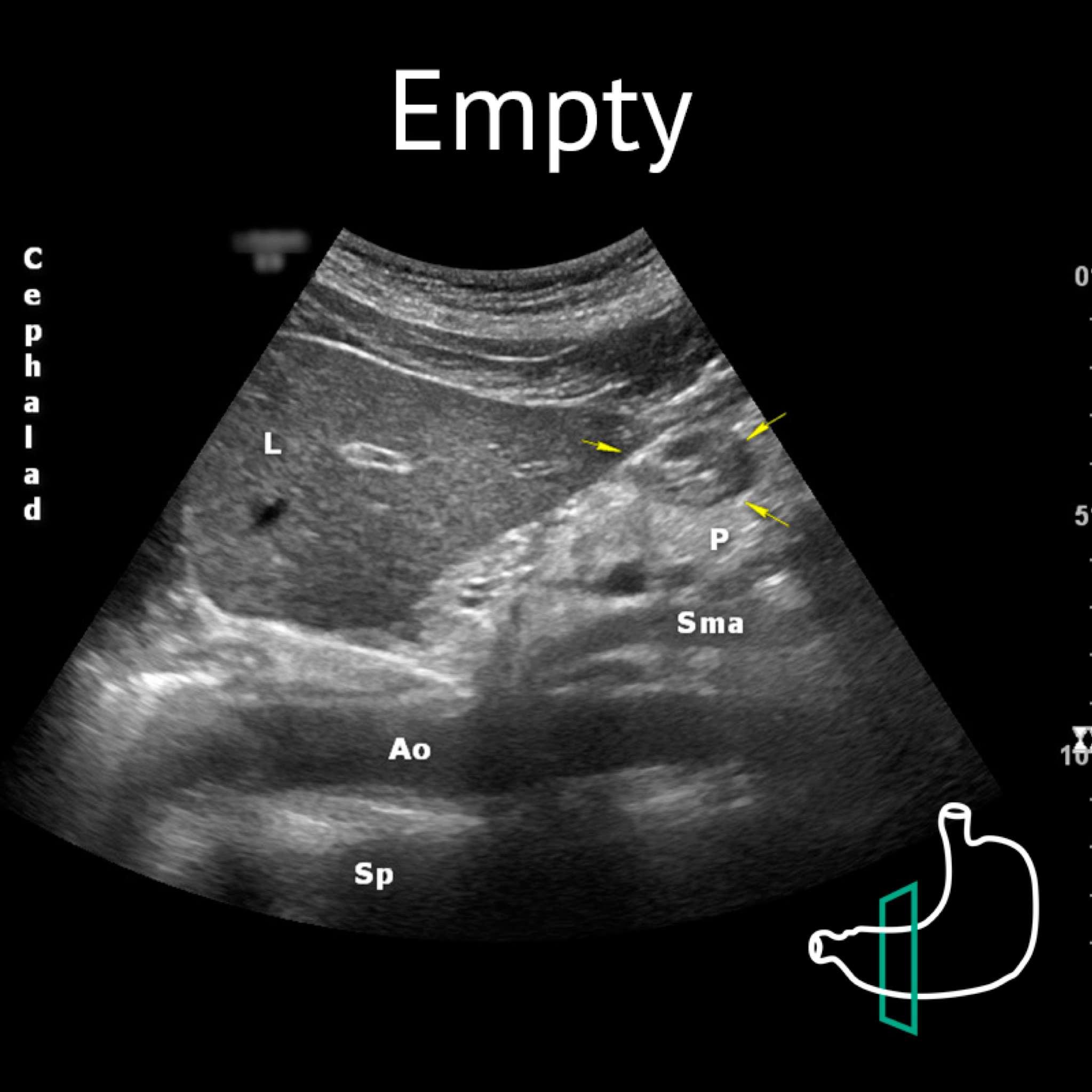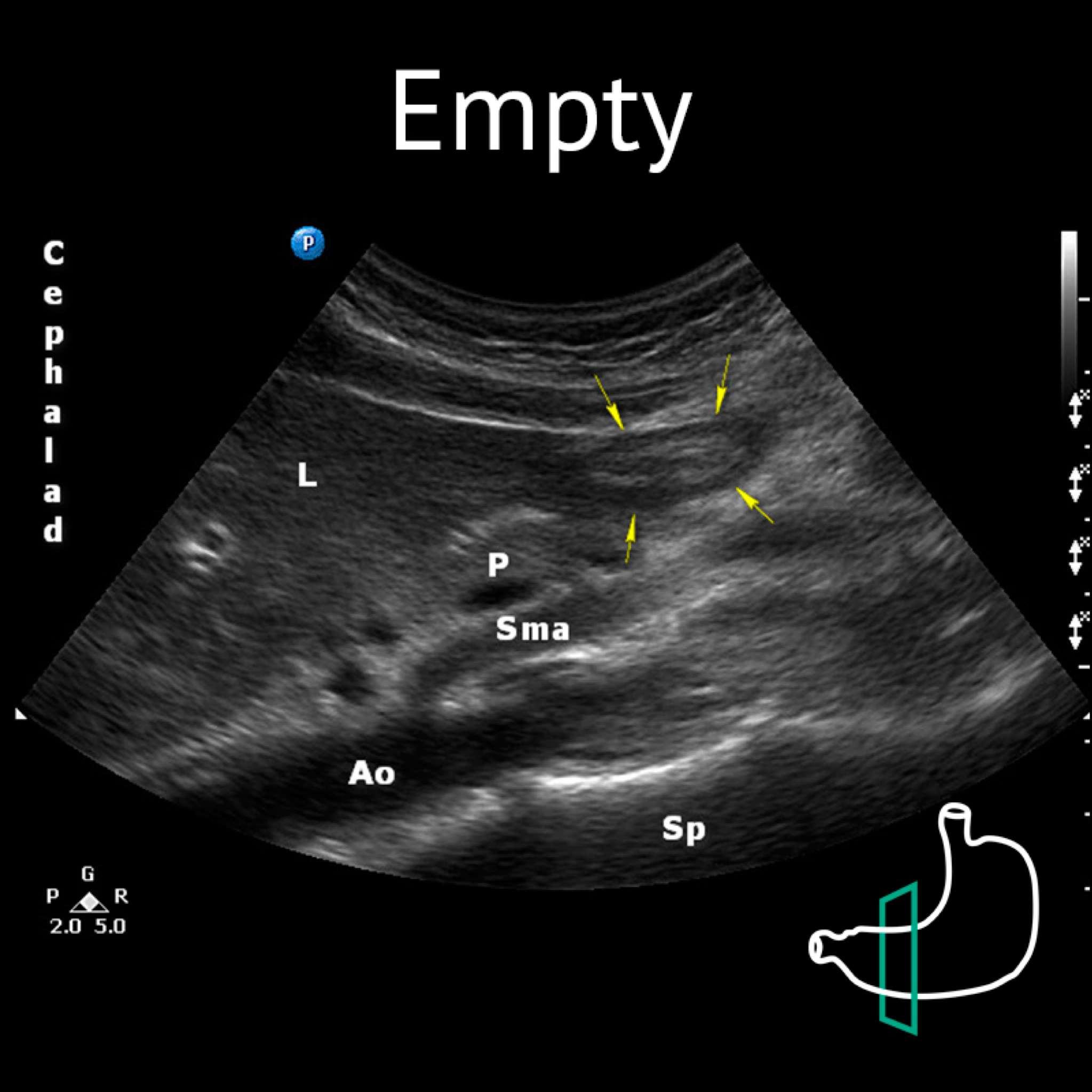 Ao: aorta; L: liver; P: pancreas; Sma: superior mesenteric artery; Sp: spine; Yellow arrows: antrum