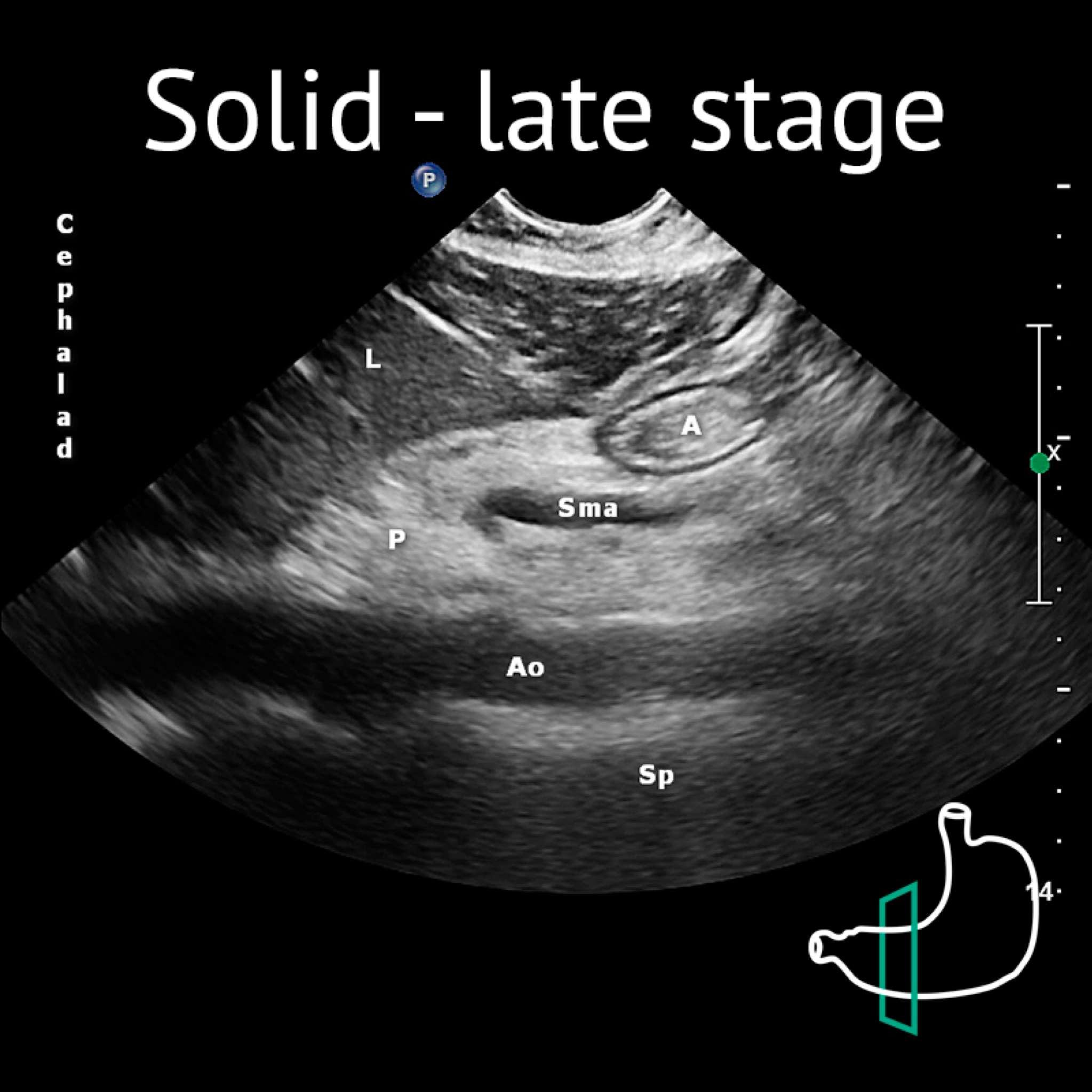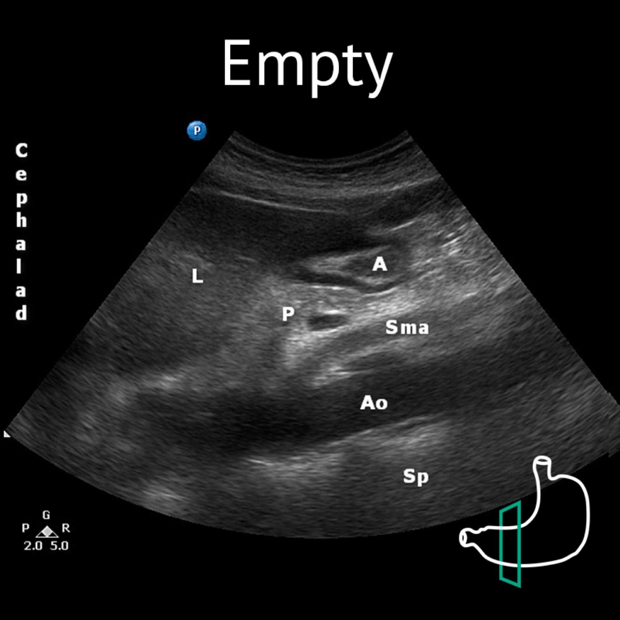 A: antrum; Ao: aorta; L: liver; P: pancreas; Sma: superior mesenteric artery; Sp: spine