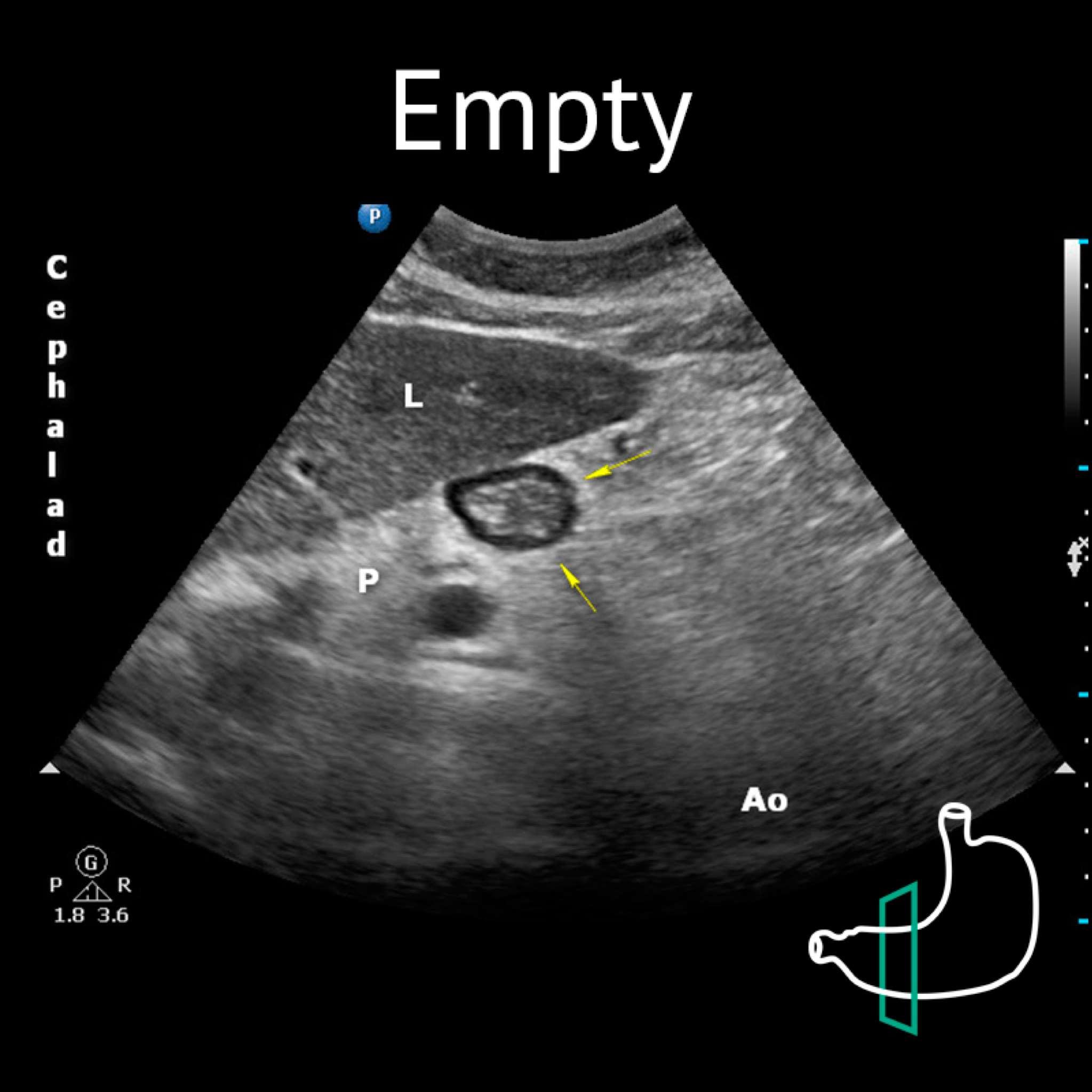 Ao: aorta; L: liver; P: pancreas; Yellow arrows: antrum