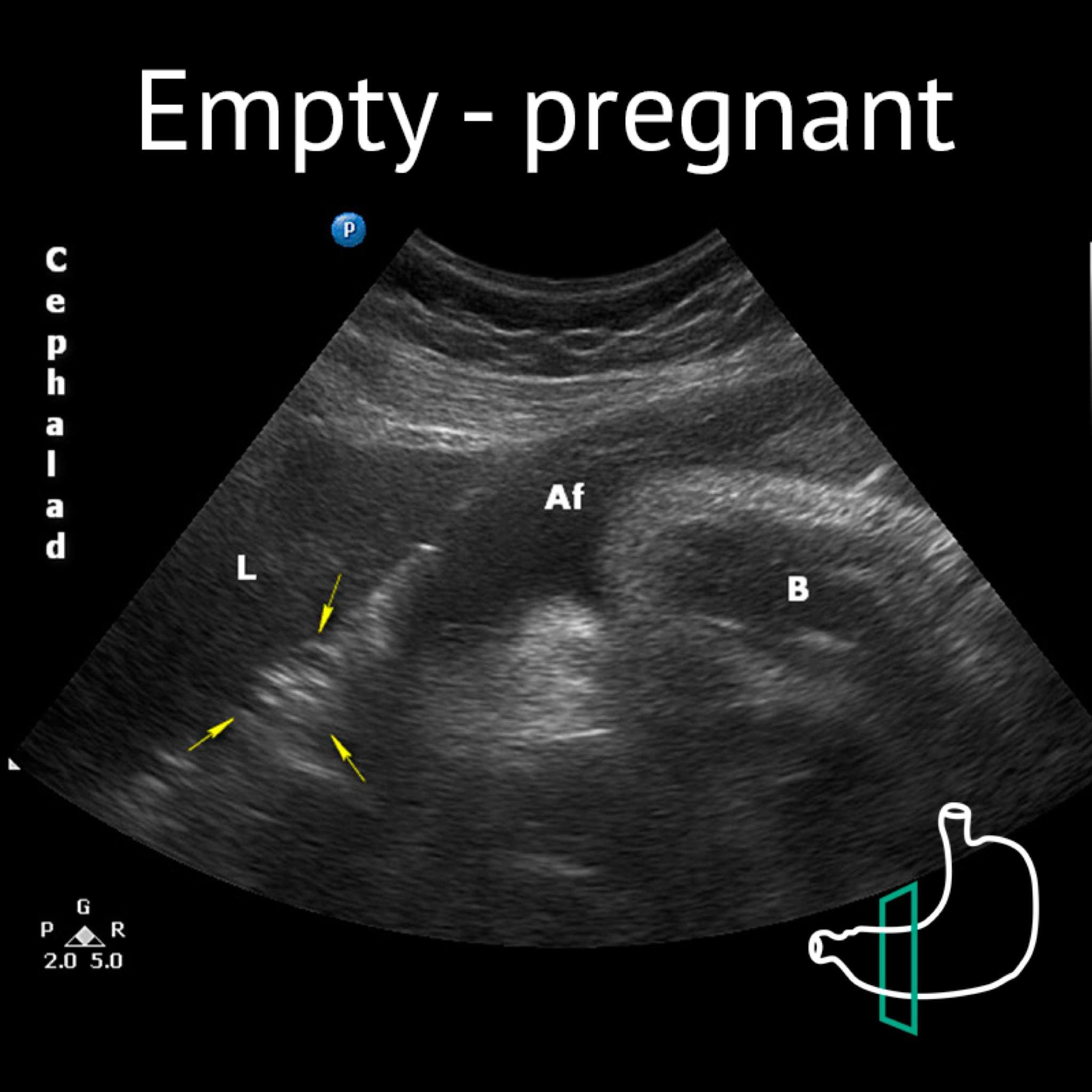 Af: amniotic fluid; B: baby; L: liver; Yellow arrows: antrum