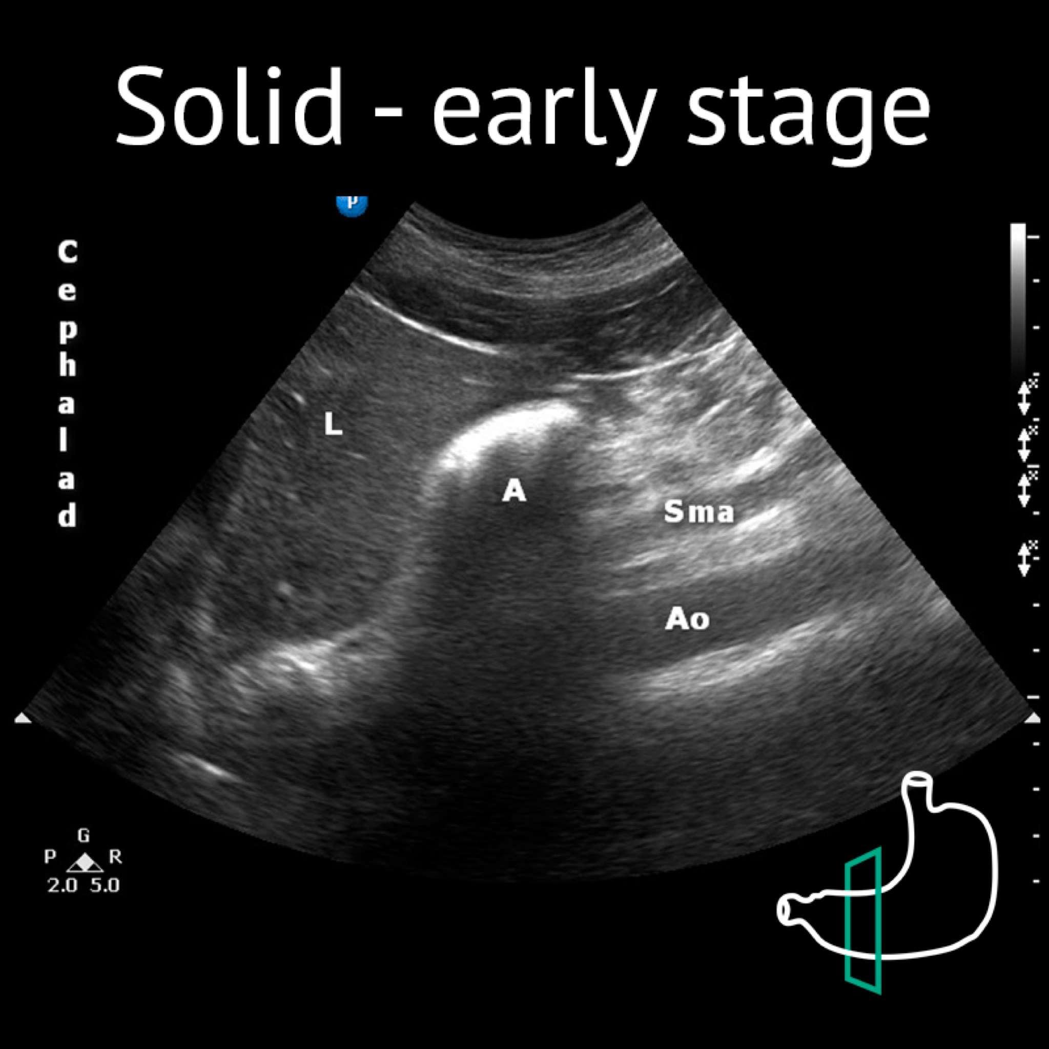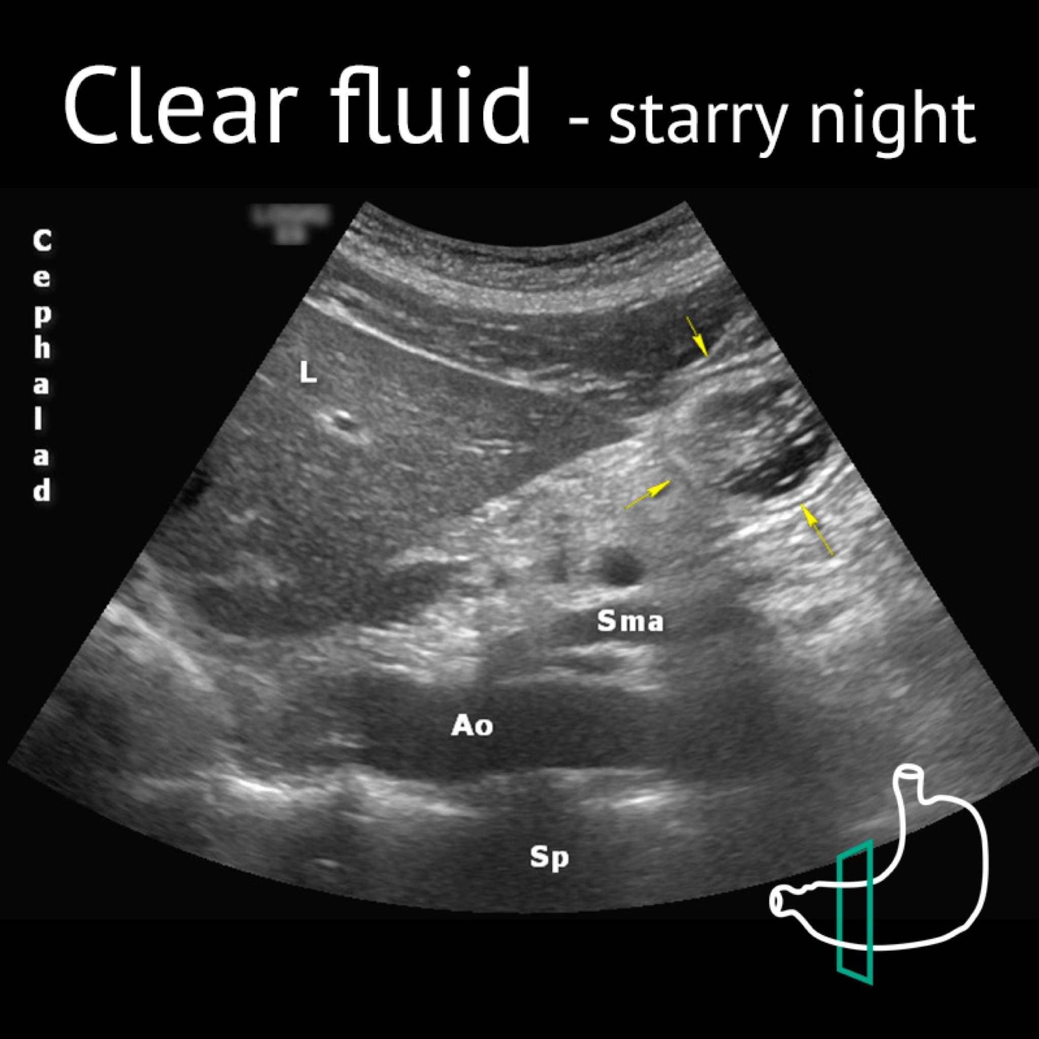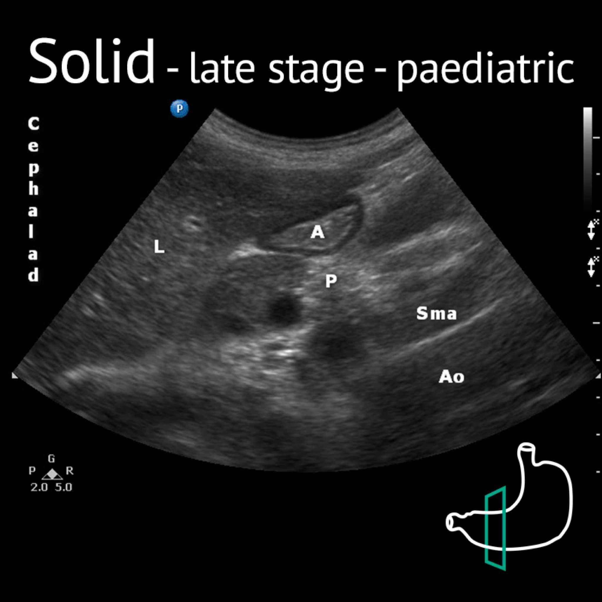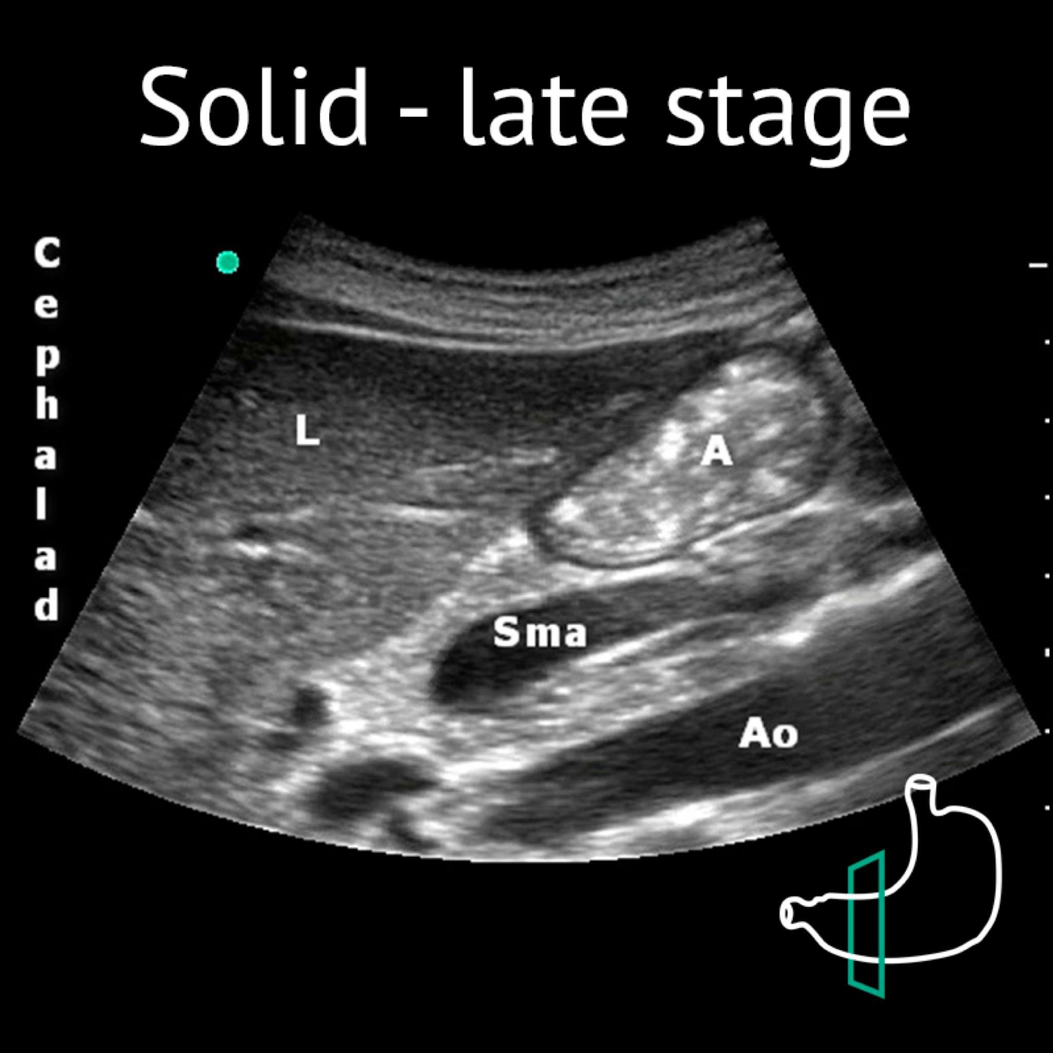 A: antrum; Ao: aorta; L: liver; Sma: superior mesenteric artery; * clear fluid