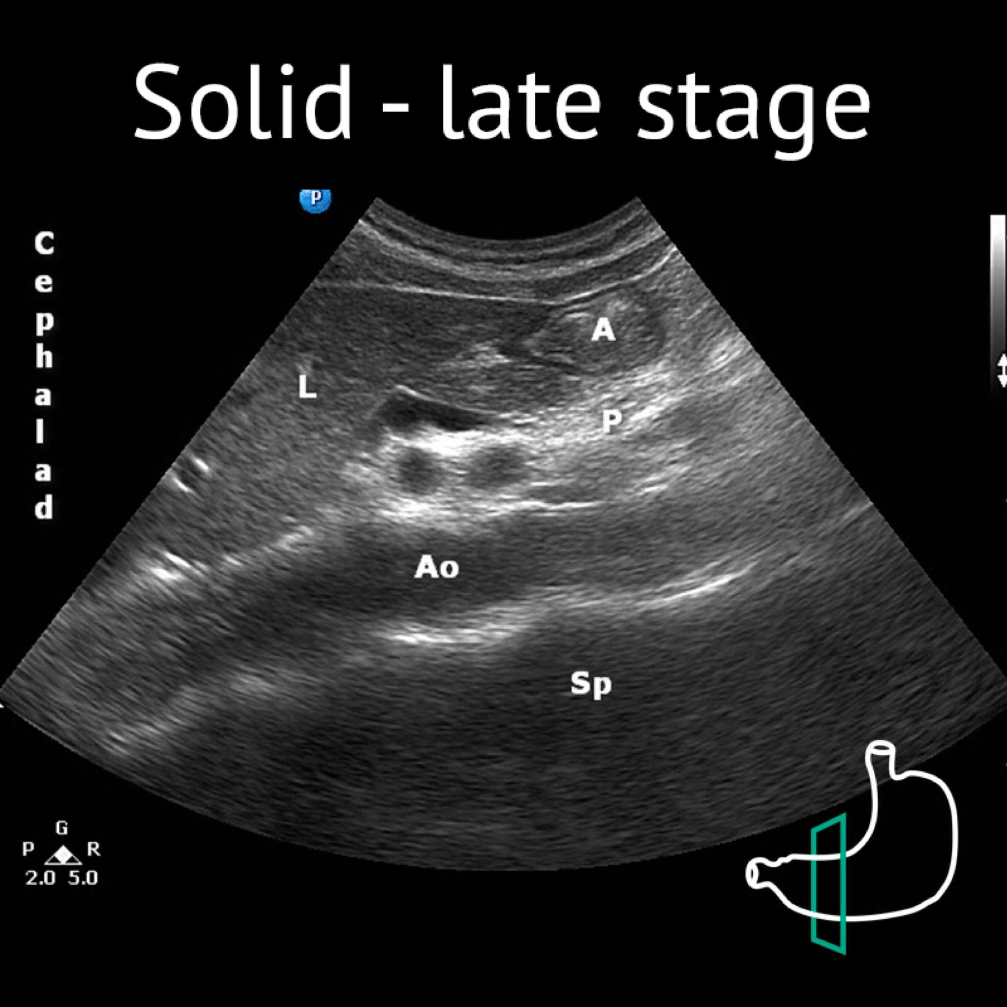 A: antrum; Ao: aorta; L: liver; P: pancreas; Sp: spine